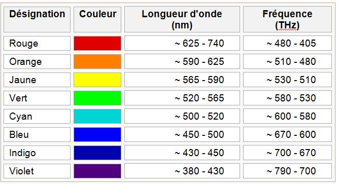 | Longueur d’onde (nm) | Champ chromatique | Couleur | Commentaire |