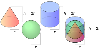 Le volume du cylindre est égal à : π × 0,52 × 1 = 0,7854, soit une fois et demi le volume de la sphère, ou 3 fois le volume du cône.