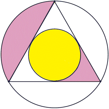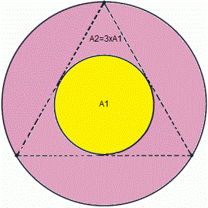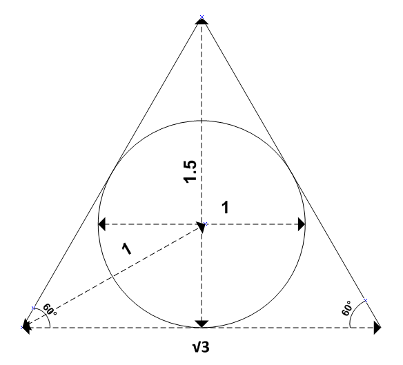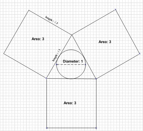 Si on encadre un cercle de diamètre 1 avec un triangle équilatéral, chaque côté du triangle est égal à racine carrée de 3. Et donc chaque carré à une aire de 3 :