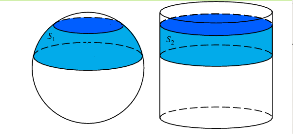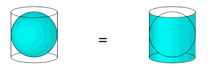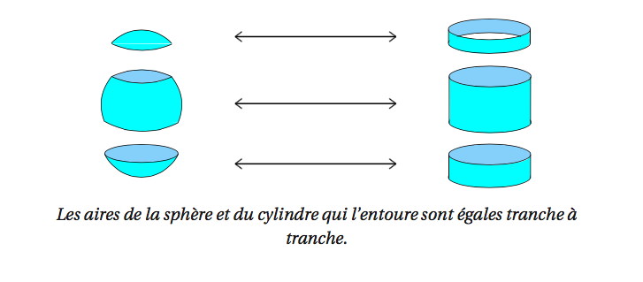 Les Surfaces (aires) de la sphère et du cylindre qui l’entoure sont égales tranche à tranche (en bleu plus clair sur les schémas ci-dessous) :